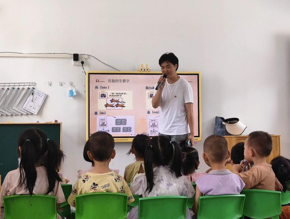 活动伊始,在幼儿园小朋友们排排坐好后,“爱筑童梦,向阳同行”实践团成员,以生动有趣的方式介绍了多个生僻字。其中,实践团成员王誉琦播放了生僻字“龘(dá)”的视频,将小朋友带入活动氛围当中。随后,他耐心教小朋友们学习“犇”、“骉”、“畾”、“瞐”等字的读音,小朋友们对此非常感兴趣并争相抢答,现场气氛热烈。