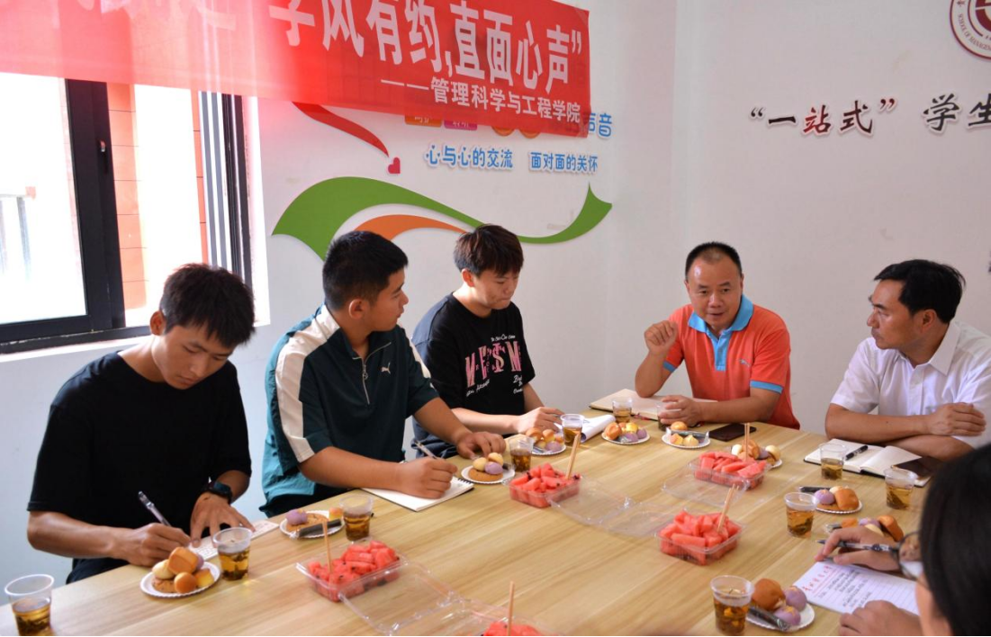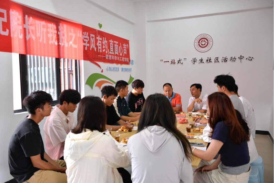 为扎实推进学生学风建设与本科教育教学审核评估工作,精准对接学生成长需求,9月19日,管理科学与工程学院青年志愿者协会在文心苑4栋五楼“一站式”学生社区活动中心举办了“儒魂锻铸”下午茶暨书记院长听我说之“学风有约,直面心声”系列主题活动。本期下午茶特邀管理科学与工程学院书记胡张林与副院长梁龙作为主讲嘉宾,各年级学生干部参加。