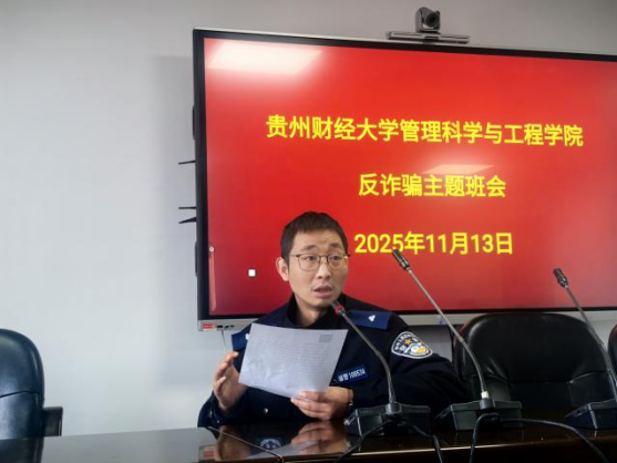 为提升师生反诈意识,守护校园财产安全,11 月 13 日,贵州财经大学管理科学与工程学院特邀贵阳市花溪公安分局方警官走进校园,开展反诈骗主题班会,为师生带来了一场干货满满的反诈必修课。