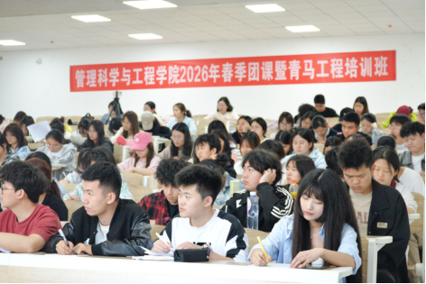 2026年4月8日,学校特邀党建组织员、校关工委委员余敏以“认真学习党的二十届四中全会精神,筑牢理想信念根基,促进成长成才”为主题,为管理科学与工程学院“青马工程”培训班全体学员讲授专题团课。